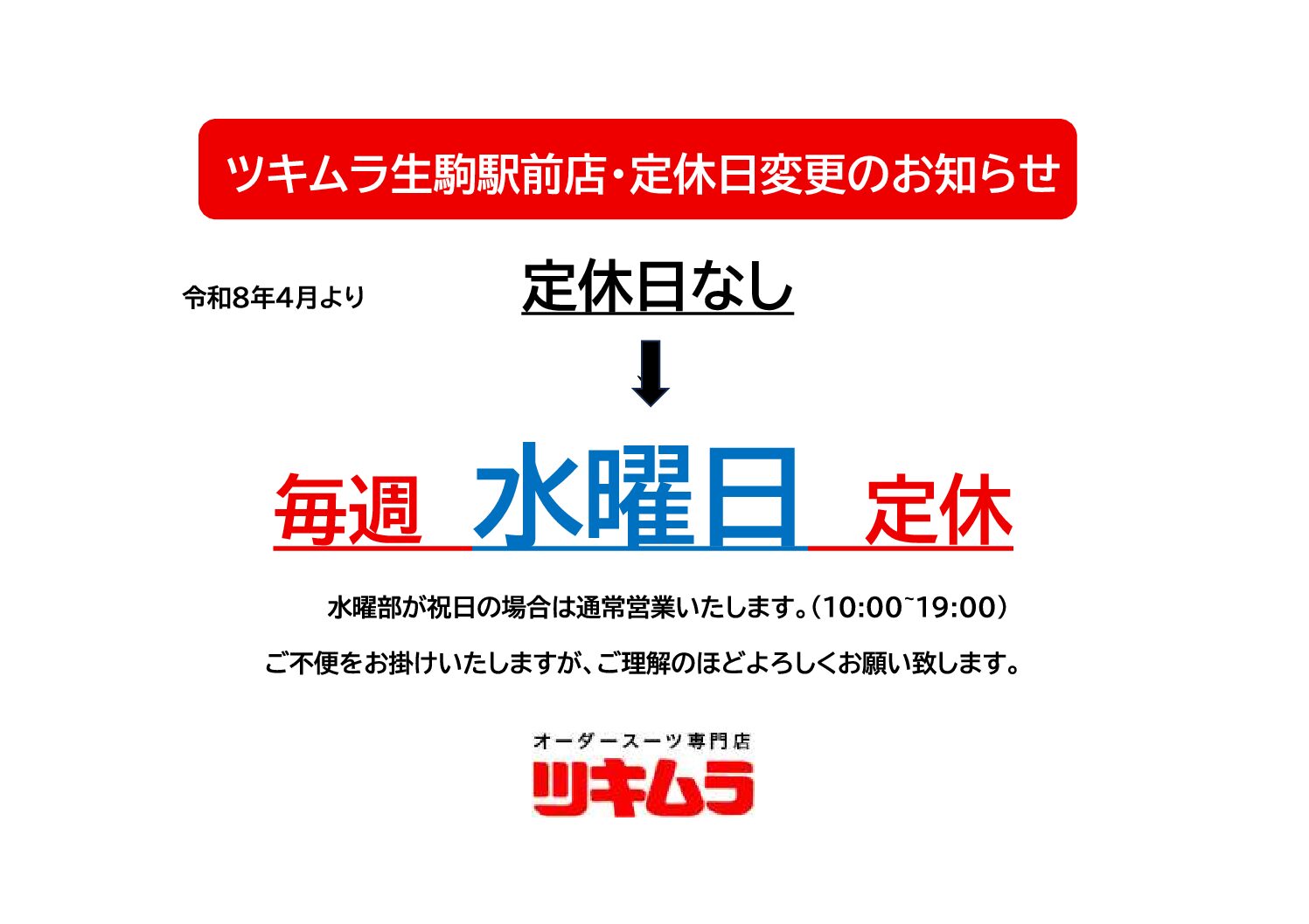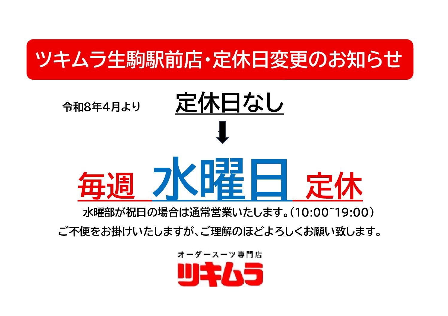 【生駒駅前店】定休日変更のお知らせ